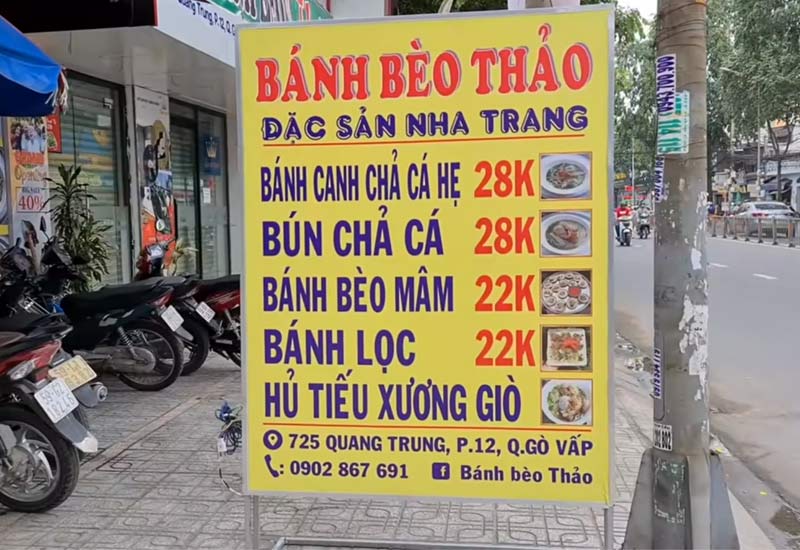 Quán bánh bèo thảo phục vụ bánh canh chả cá hẹ, bún chả cá, bánh bèo mâm, bánh lọc và hủ tiếu xương giò tại 725 Quang Trung, P. 12, Q. Gò Vấp