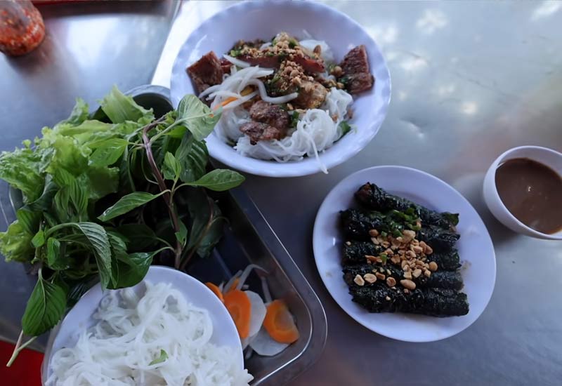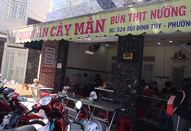 Quán Cây Mận có Nem Nướng được cuốn quanh khúc mía, món nem ngọt và mềm rất đáng thử một lần. Thịt nướng khá ngon, chả bò cuốn lá lốt rất tuyệt vời.Quán Bún Thịt Nướng Cây Mận