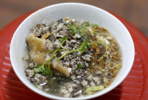 Cũng hết nhanh nghỉ sớm là hàng bánh đúc ở Nguyễn Bỉnh Khiêm. Hơn 18h mới tới đây thì chắc bạn chẳng gì để ăn, may ra còn chút cháy bánh đúc còn sót lại. Nước ở đây có đôi chút khác biệt khi hơi chua chua nên ăn không thấy ngán, thịt băm mộc nhĩ cũng khá nhiều