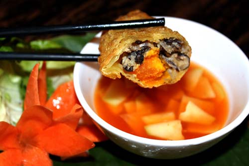 Chiếc bánh được chiên vàng giòn rụm, phần nhân bên trong hấp dẫn nhờ cái béo của thịt, giòn sần sật của miến, mộc nhĩ hay cái bùi bùi đậm đà của trứng.