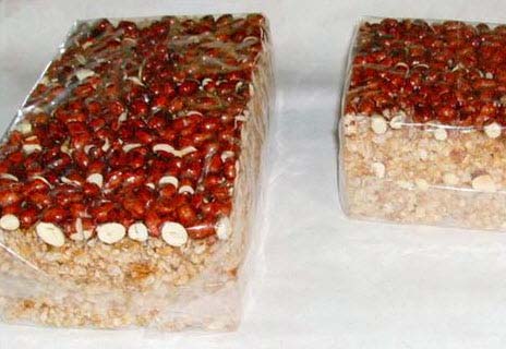 Bỏng nếp đã sẵn sàng. Cho bỏng vào chảo đường đang sôi, nhanh tay đảo để đường và bỏng quyện đều nhau. Đổ ra khuôn gỗ vuông, dàn đều, dùng chai thủy tinh cán qua cán lại nén cho chặt.