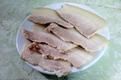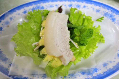 Tại quán, món ăn được khách yêu cầu nhiều nhất là bánh tráng cuốn thịt heo. Mỗi suất ăn gồm 6 miếng thịt heo thái to bản, nửa phần nạc, nửa phần mỡ. Theo anh chủ quán cho biết, quan trọng là phải biết cách giữ lửa lúc luộc, sao cho thịt không chín nhanh quá hay chậm quá. Như vậy, phần mỡ mới có độ trong, miếng thịt mới mềm và thơm.