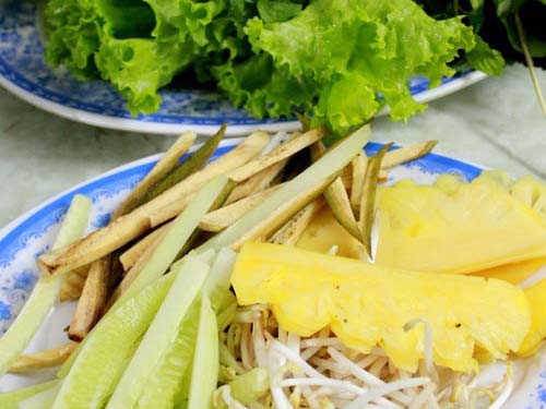 Kèm theo mỗi suất thịt là bánh tráng, bánh phở và rất nhiều các loại rau ăn kèm. Khi ăn, bạn lấy một miếng bánh tráng, một miếng bánh phở, xếp lên trên đó các loại rau ăn kèm và một miếng thịt rồi cuộn lại. Chỉ cần cắn một miếng, bạn có thể cảm nhận được sự tươi mát của xà lách, vị thơm nồng của rau bạc hà, rau thơm, rau diếp cá, tía tô, đinh lăng, vị chát nhẹ của chuối xanh, vị chua dịu của dứa. Tất cả hòa quyện một cách tài tình với lớp bánh tráng dai dai, miếng bánh phở mềm mại, miếng thịt heo thái mỏng ngọt thơm cùng mắm nêm đậm đà, làm thỏa mãn vị giác của rất nhiều thực khách.