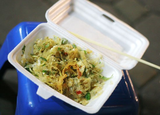Cuối cùng cô chủ hàng lại cho tiếp hành khô được phi thơm, bò khô, cá khô, quả trứng cút luộc, rau răm vào âu và trộn đều tất cả lên. Nếu muốn ăn cay bạn nhớ dặn luôn nhé, để được cho thêm sa tế vào, còn không thì cũng nhắc luôn vì cay lắm đấy. Một suất bánh tráng trộn có giá 20.000/suất, chất lượng món ăn cũng như chất lượng vệ sinh khá ổn.
