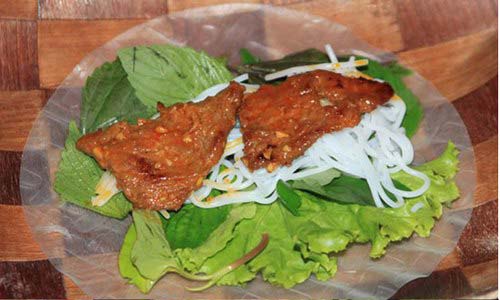 Món ăn được chế biến khá đơn giản với thịt bò tươi, ăn kèm là bánh tráng, bún, rau sống các loại và mắm nêm.