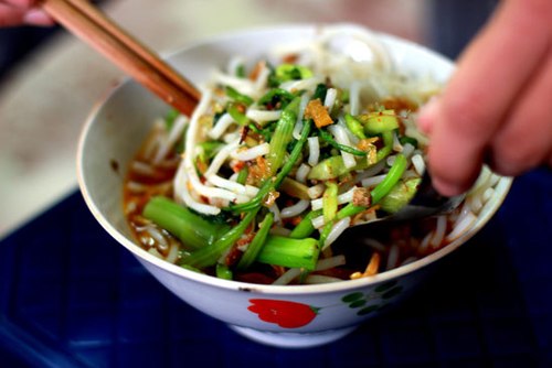 Khi ăn, bạn trộn đều bát canh bún sẽ cảm nhận ngay được vị ngọt của cua, mùi thơm của hành phi, vị bùi của tóp mỡ và vị mát, thơm của rau xanh. Bạn có thể chọn rau cải, rau muống, rau cần hay ăn lẫn cả ba loại, tất cả đều được chần vừa chín tới nên vẫn giữ được màu xanh mát mắt. Ai thích ăn cay cũng có thể cho thêm ớt chưng do chính tay cô chủ quán làm.