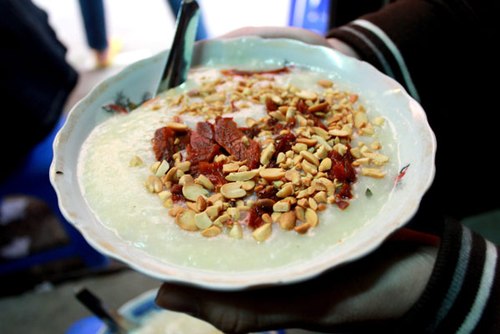 Không giống các hàng khác hay nấu cháo với đậu xanh còn nguyên hạt và vỏ, quán có cách thức riêng để hạt đậu xanh tan nhuyễn với gạo. Chỉ cần ăn một thìa, bạn sẽ cảm nhận được vị đậu xanh thơm bùi hòa quyện với vị tía tô, hành hoa trong bát cháo đặc sánh.