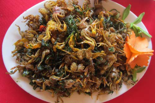 Cua đồng rang lá lốt, một món ăn dân dã và phổ biến tại Ninh Bình, mang đậm hương vị đồng quê mà du khách nên thử khi ghé qua đất cố đô. Cua đồng bắt về được làm cẩn thận, lá lốt rửa sạch thái sợi sau đó hai nguyên liệu chính này được rang chung với nhau theo một công thức nhất định. Chính vì không sử dụng cua nuôi mà món ăn này mang đến cho thực khách nhiều cảm nhận bất ngờ. Đó là vị giòn tan của cua đồng kết hợp cùng vị thơm đặc trưng của lá lốt. Món ăn này ngon nhất khi được kết hợp cùng cơm nóng.