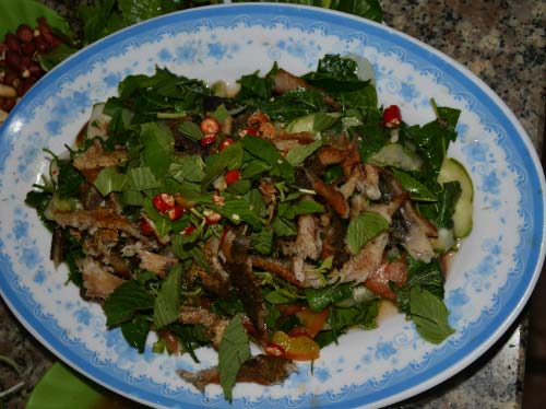 Lá non và hoa sầu đâu được rửa sạch trụng qua nước sôi để bớt đắng, sau đó cho ráo nước. Dưa leo thái mỏng, thơm cắt nhỏ vừa ăn, xoài thái mỏng hoặc xắt sợi. Khô cá sặc nướng hoặc chiên xé nhỏ, thịt ba rọi luộc cũng được cắt nhỏ, tất cả nguyên liệu trộn với chút gia vị. Nước chấm là nước mắm me được chế biến đơn giản với nước me dầm đã lọc xác và đun sôi đến sệt, nêm nếm vừa ăn. Khi ăn món này cảm giác lúc đầu là vị đắng thanh kết hợp vị chua của nước chấm, càng nhai kĩ sẽ càng cảm nhận được vị ngọt của món gỏi sầu đâu.