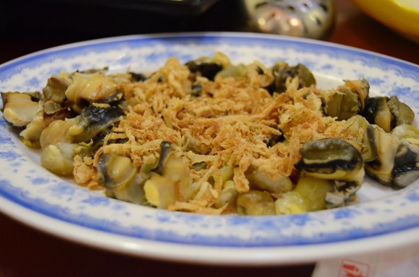 Ngoài nước dùng, lẩu ốc còn trở nên khó quên hơn với từng viên há cảo nhỏ xinh, thả lẫn trong nồi nước. Khác với há cảo thông thường có lớp vỏ mỏng, ăn hơi bở, há cảo loại đặc biệt dùng để chế biến lẩu ốc có lớp vỏ trắng dày, dai mướt như bánh bột lọc; bên trong là nhân thịt băm đậm đà. Khi đưa lên miệng, miếng há cảo như trôi tuột vào bụng, khiến ít thực khách có thể từ chối.