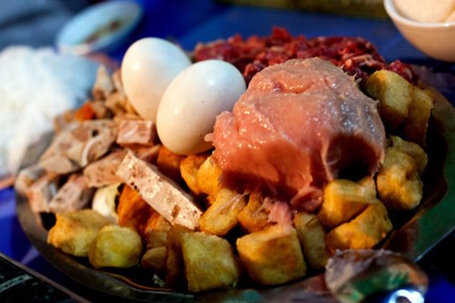 Điểm đặc biệt của quán là đĩa đồ ăn để thả vào nồi lẩu. Ngoài thịt bò và đậu, mỗi đĩa đồ ăn còn có sườn sụn, giò tai, trứng vịt lộn và giò sống. Nếu muốn đổi vị, bạn có thể gọi thêm tôm với giá 40.000 đồng một lạng hoặc trứng và tràng gà với giá từ 30.000 đồng đến 50.000 đồng một đĩa. Các món này đều giúp tăng vị đậm đà của nước dùng mà lại không quá ngấy. Bên cạnh đó, còn có rất nhiều loại rau sống và nấm mà khi ăn, bạn chỉ cần nhúng qua là có thể thưởng thức được.