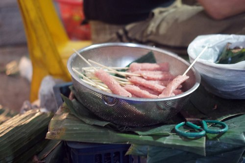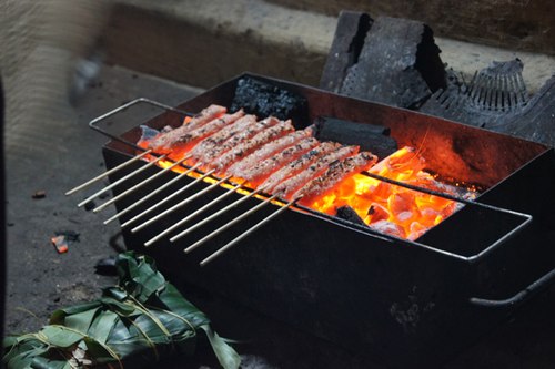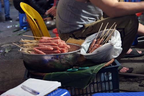 Những xiên nem chua sau khi được nướng xong được đem ra ngay cho khách. Không giống nem chua rán vốn khô và có màu vàng ruộm, nem chua nướng vẫn giữ nguyên được màu hồng tươi của thịt cùng với một chất keo dinh dính bao bọc bên ngoài. Chấm một chút ớt trong chiếc bát đựng nhỏ, mùi thơm cùng miếng nem nướng như hòa quyện và tan ra khi đưa lên miệng. Ngoài nem nướng, bạn còn có thể chọn những món nhắm khác như cá chỉ vàng, cá bò hay mực nướng...