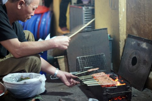 Quán nem chua nướng số 10 Ấu Triệu mở cửa từ 14h cho tới 0h sáng. Tuy được gọi là quán nhưng nơi này rất đơn giản. Bàn ăn ở đây thực chất chỉ là những chiếc khay đặt trên ghế xanh xếp liền nhau và đặt ở một phía của ngõ để không chắn đường đi lại. Bên cạnh những dãy bàn như thế là hình ảnh quen thuộc của chủ quán đang thoăn thoắt xoay những xiên nem chua hồng tươi đầy quyến rũ trên ngọn lửa than đỏ rực. Trong lúc chờ nem chín, bạn có thể nhấm nháp một đĩa củ đậu cùng với cốc trà chanh mát lạnh.