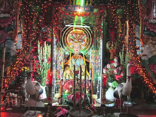 Đặc biệt trong chùa có 8 cây nến: 6 cây lớn chưa đốt và 2 cây nhỏ hơn đang cháy. Trọng lượng mỗi cây nến lớn khoảng 200kg, cao 1,6m, ước cháy liên tục khoảng 70 năm. Hai cây nến nhỏ đã cháy từ khi ông Ngô Kim Tòng qua đời, năm 1970, dự kiến thời gian cháy hết khoảng 35 năm, nhưng năm 2006 vẫn đang cháy và có thể cháy tiếp vài năm nữa. Tại đây còn có 3 cây hương (nhang) mỗi cây cao 1,5m chưa đốt.