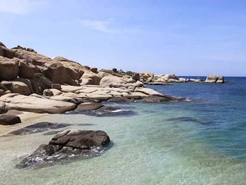 Nơi đây, đá bạt ngàn, những lùm cây xanh chen vào đá, pha sắc xanh vào màu nâu bóng thời gian của đá, một bãi cát trắng mịn màng chạy dài uốn cong bao bọc đảo, làn nước trong xanh có thể nhìn tận đáy biển, nơi từng đàn cá tung tăng bơi lội, đảo còn nguyên dáng vẻ hoang sơ với thảm thực vật phong phú, đa dạng, khí hậu trong lành, mát mẻ. Nhìn qua làn nước, những viên đá cuội, sỏi, vỏ ốc ẩn hiện đầy bí ẩn, dọc hai bên con đường mòn là cỏ và hoa dại đẹp mắt, loài hoa màu trắng muốt, hương thơm ngây ngất nở đầy trên đảo.