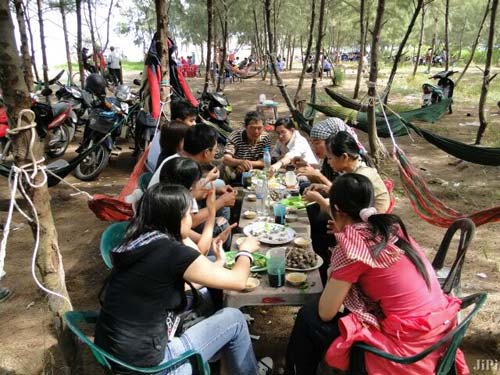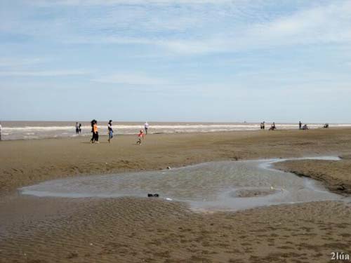 Thưởng thức xong món bánh xèo hay các món đặc sản biển, du khách có thể tiếp tục ngã lưng trên những cánh võng được mắc trong các dãy nhà nối dài. Hay du khách tự mắc võng dưới hàng dương xanh mát, để tận hưởng không khí trong lành của biển phù sa trên đất xứ dừa. Tuy là bãi biển phù sa, nhưng nơi dây vào các dịp lễ hàng ngàn du khách từ các nơi đổ về để vui chơi, tắm biển đông nghẹt. Bãi biển đã được xây dựng bờ kè bê tông, tương lai nơi đây sẽ tạo ra không gian sinh thái xứ biển lý tưởng, thích hợp nghỉ ngơi, an dưỡng, nhất là cho người cao tuổi.