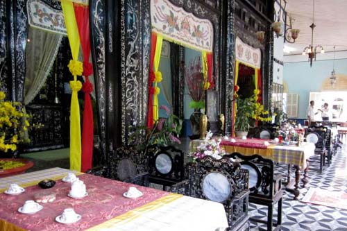 Bước vào bên trong, đặt chính giữa nhà là một bộ bàn ghế cẩn ốc xà cừ, mặt ghế và lưng tựa ốp phiến đá cẩm thạch trông sang trọng (nghe nói, ngày xưa, chỉ những vị khách quan trọng mới được mời ngồi bộ ghế này). Hai bên của bộ bàn ghế đó còn có mấy bộ bàn ghế khác, mỗi bộ có bốn ghế bành bằng gỗ cẩm lai chạm trổ rất tinh xảo, đều cẩn xà cừ và đá cẩm thạch. Kế tiếp là hai bộ ván cẩm lai dài hai mét rưỡi, dày năm phân rưỡi, lâu ngày lên nước bóng lưỡng, soi mặt cũng được. Ngang với hai bộ ván là hai chiếc bàn tròn cũng bằng gỗ cẩm lai, mặt bàn đường kính một mét hai là một tấm gỗ ròng xẻ từ nguyên thân cây cổ thụ.