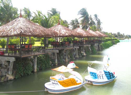 Điểm nhấn không thể bỏ qua khi nhắc đến KDL Champa Island Nha Trang là khuôn viên Garden: Với hình ảnh của dãy nhà thủy tạ ven sông trong không gian trong lành, thoáng mát giữa những hàng dừa, hàng tre cao vút gió, bên cạnh dòng sông Cái êm đềm.