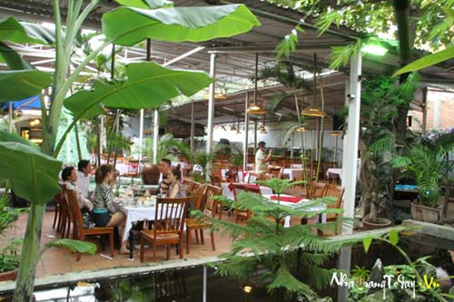 Còn khu vực sân vườn có các thác nước và hồ nước cùng với rất nhiều cây xanh tạo nên một không gian mở thoáng mát, hòa với thiên nhiên. Đưa thực khách đến một cảm giác thoải mái khi ngồi thưởng thức các món ăn tại nhà hàng.