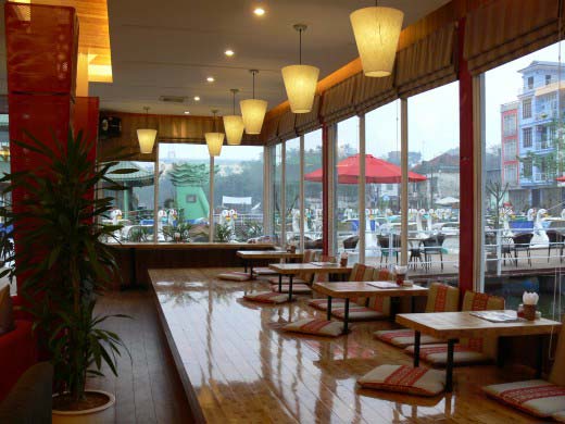 Tầng 1: Vách kính dài 2 bên, bạn có thể phóng thẳng tầm mắt ra Hồ Tây rộng lớn, nội thất với tông màu đỏ, trắng, đen sang trọng và ấm cúng
