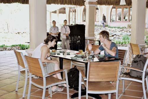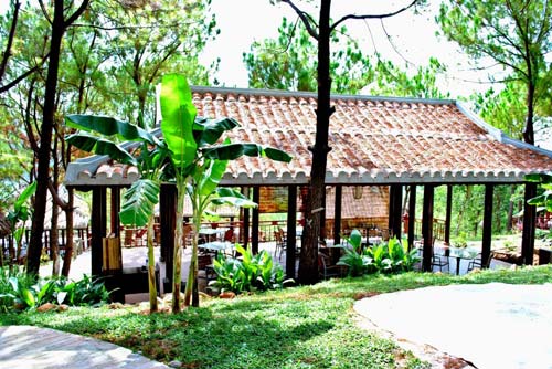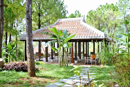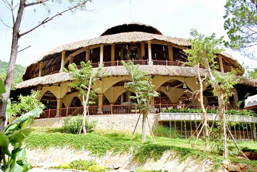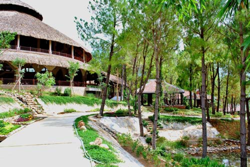 Cả công trình là một tổng thể hài hòa theo lối kiến trúc dân dã miền Trung được tạo nên từ những vật liệu xây dựng gần gũi với tự nhiên như: gạch, gỗ, mây, tre, lá… hòa quyện trong một không gian xanh của biển, thung lũng và rừng thông kim rũ bóng.