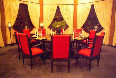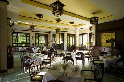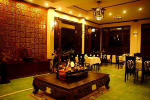 Đẩy cánh cửa gỗ chạm trổ họa tiết cổ xưa ngay lối vào, hãy đừng ngạc nhiên vì một kiến trúc sang trọng, quý phái nhưng cũng rất đỗi thân quen. Hộp đèn gỗ cổ xưa trên trần nhà rải ánh sáng vàng dịu, mang dáng dấp cung đình vừa cổ xưa, vừa tao nhã. Những chiếc quạt cổ nhẹ nhàng tỏa những làn gió dịu mát, xua đi cái nóng nực. Bộ bàn ăn chạm trổ mềm mại, những tượng Phật hiền từ ngay lối vào toát lên một không khí thiền và tịnh tâm, những phù điêu Chăm trong nhà hàng tạo nên một vẻ đẹp bí ẩn, chất chứa những hoài niệm về một nền văn hóa xán lạn từng hiện diện trên mảnh đất này. Bàn ghế ngăn nắp, những bộ chén đĩa dịu ngọt màu men xanh ngọc ẩn hiện những đóa sen hồng. Các cô gái trong tà áo dài duyên dáng luôn nở nụ cười tươi thắm chào đón những vị khách phương xa... Những nụ cười xinh, hiền và sáng như nắng sớm, như cái đẹp vừa quý phái, vừa bình dị của nơi đây đủ làm say lòng thực khách, dù chưa thưởng thức món ăn hay ly rượu nào.